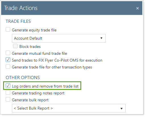Log trade files that you intend to execute by clicking Log Trades on the Trade Actions dialog box before you create the trade file. For more information, see Trade List and Creating Trades.