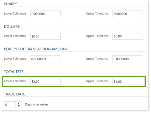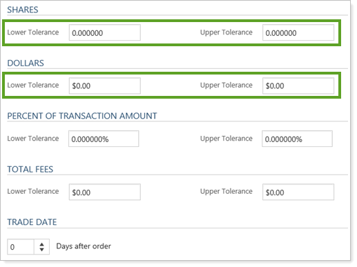 Your reconciliation tolerances allow you to set tolerance bands around the transaction criteria for a trade. The transaction amount includes dollar traded, as well as any fees applied to the trade. Tolerance amounts can be set in several ways, including number of shares, dollars, and percent of transaction criteria.