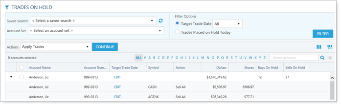 The Reconcile Trades page offers filters and columns that help you find what you need and take action efficiently. For information on features of the Reconcile Trades page, see Reconcile Trades Page Actions, Views, and Filters.