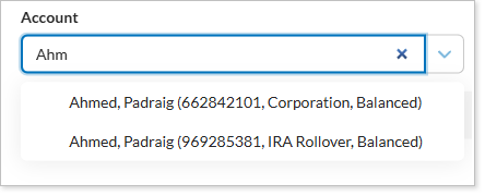 In the Quick Trades dialog, under Account, start typing the account or group name or number. Select the appropriate record when it appears. This field will be unavailable if you're generating a quick trade on a Rebalance Summary report.