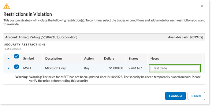 You can override a security with restrictions using Quick Trade and a note will be required. Pay attention to warnings during the rebalance to ensure you're submitting the trades that you intend to submit.