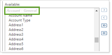 The columns available to add to your bulk report are broken into section types. For example, the Account - General section type contains columns related to general account settings, such as address, account type, description, tax status, and so on. Use these section types to identity columns you might want to add to your bulk reports.