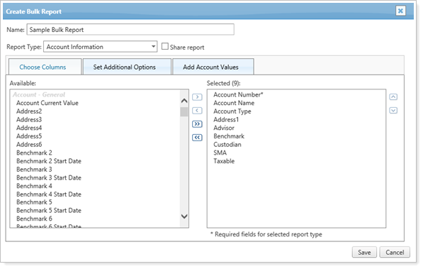 Bulk reports allow you to create reports based on the data parameters you set. First, you select the report type to determine what information you want to include in the report—for example, the Account Information bulk report displays account details—and then customize which columns of data you want to include in that bulk report.