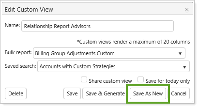 button on the Custom Views page so you won't have to set up the view each time. All settings, including custom column widths, filter options, and sorting will be saved. If it's a shared custom view, all other users will also have these settings applied the next time they use the report.