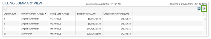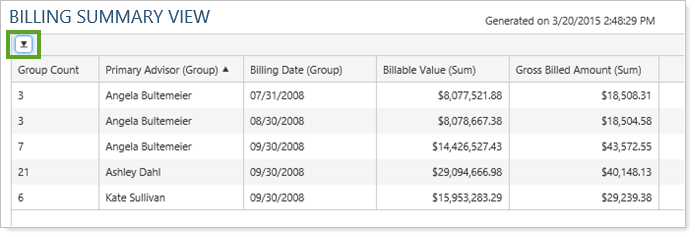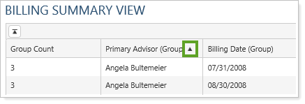 You can select multiple columns if you want groups to be broken out in more than one way. For example, you could group by both primary advisor and billing date, and each group would have a shared date and advisor.