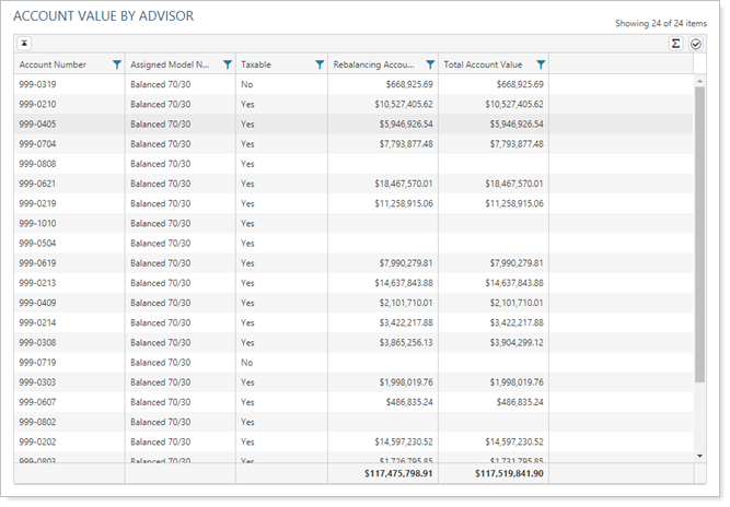You want to view account values for accounts assigned to a particular advisor. To do this, you first create the Account Information bulk report so that it contains columns such as Rebalancing Account Value and Total Account Value. Then, you create a saved search to specify a particular advisor, and use these to create your custom view.