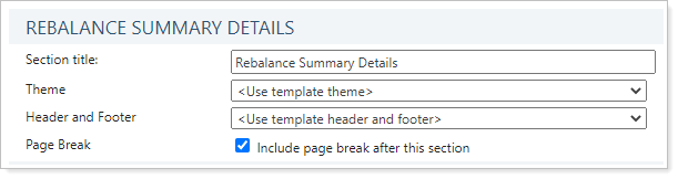 When creating a PDF template that contains the Rebalance Summary Details report, you can use these settings to customize how the report appears: