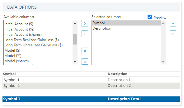 - Available/Selected Columns. Include and arrange columns of data points in the desired order.
