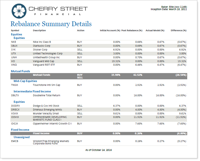 Use the Rebalance Summary Charts PDF report section alongside this report to visually represent proposed trades.