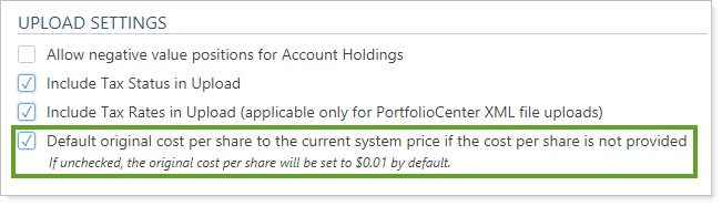 The Default original cost per share to the current system price if the cost per share is not provided option is a system setting that affects the way Tamarac Trading views original cost per share when it's not specified.