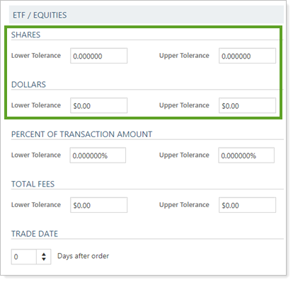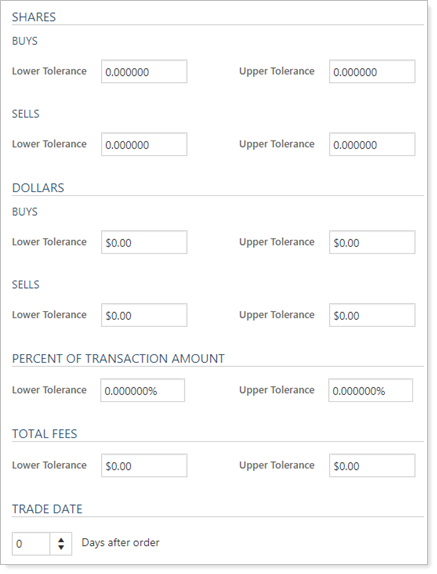 Your reconciliation tolerances allow you to set tolerance bands around the transaction criteria for a trade. The transaction amount includes dollar traded, as well as any fees applied to the trade. Tolerance amounts can be set in several ways, including number of shares, dollars, and percent of transaction criteria.