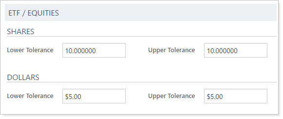 ETFs/EquitiesFor equities and ETFs, as long as one field matches exactly, in either the Shares or Dollars fields, differences in fees and trade date will be ignored as long as they are within their set tolerance. If fees or trade dates are outside their tolerance, the trade will not auto-reconcile.