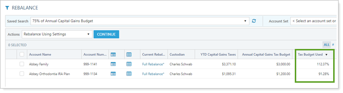 When you apply this saved search to a rebalance workflow page, you can quickly filter the page based on the percentage of tax budget met.